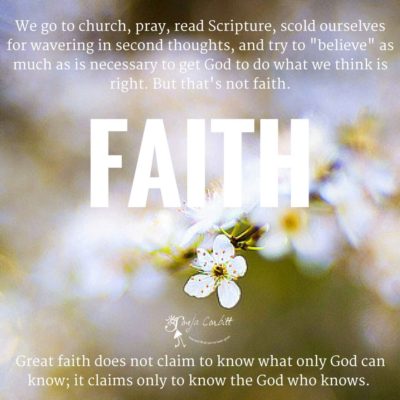 Faith is not faith in the quality or quantity of our faith or trust in our beliefs. It is not believing what we want to happen will happen. Nor is it trust in our ability to read God’s secret will. Faith, quite simply, is trust in God alone: His timing, His provision, His goodness, His answers to our prayers.